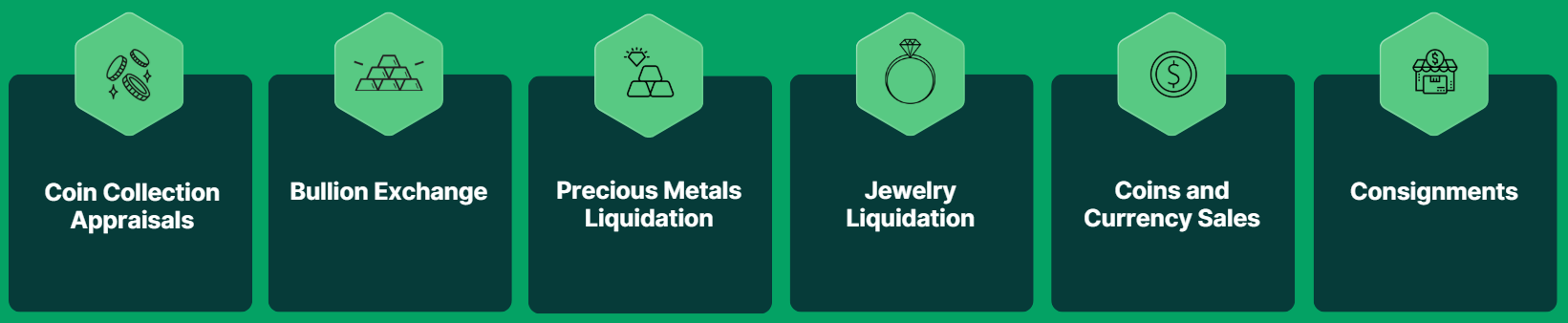 Customers may also buy bullion and collectible coins for investment or personal collections, including both commonly sought-after pieces and unique, one-of-a-kind items. Additionally, we offer consignment services, displaying items in our shop or listing them through e-commerce platforms.